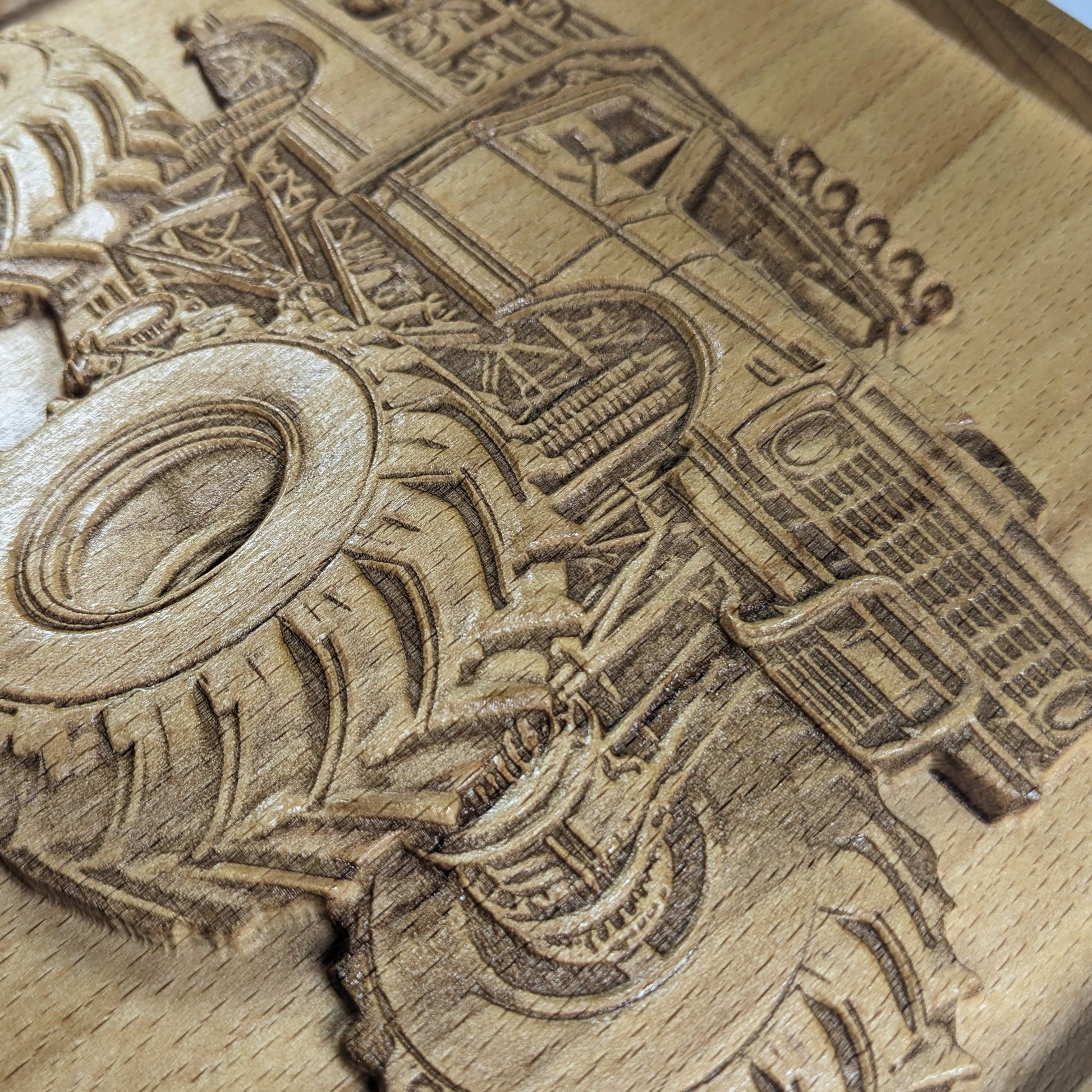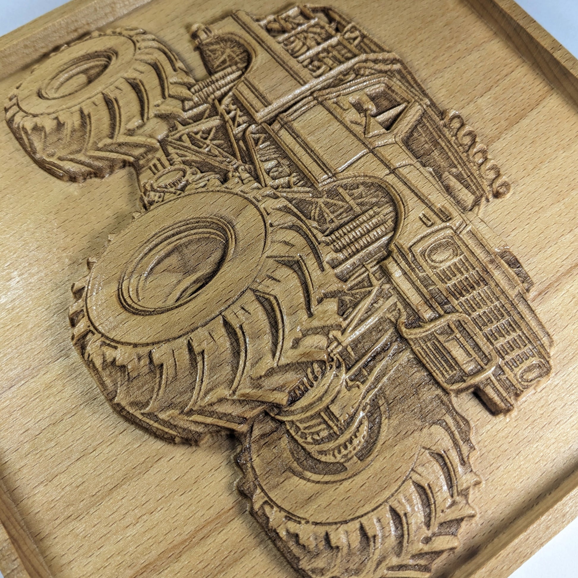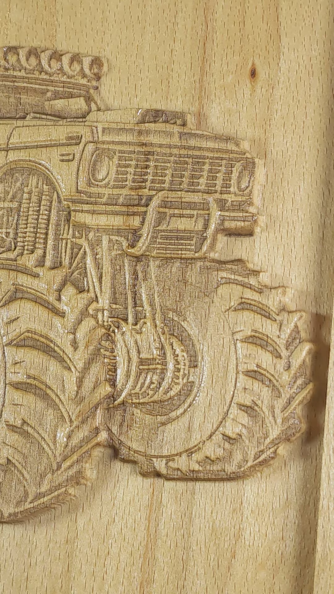 I made this Monster Truck wall art for kids (and grown-ups!) who love bold wheels and wild imagination. Each piece starts with solid beech wood and is CNC carved for depth, then hand-sanded and laser engraved to bring out every detail of the truck—tires, grill, and all. I finish it with shellac to preserve the natural look and feel of the wood.